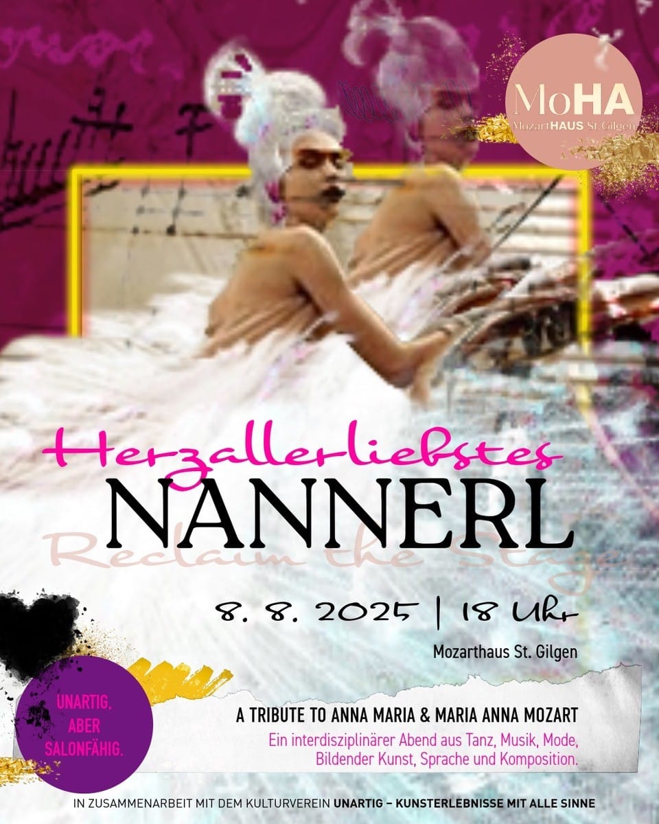 Das MoHA St. Gilgen lädt zu einer interdisziplinären Kulturveranstaltung ein, in der zeitgenössische Künstlerinnen auf ganz persönliche Weise mit dem Erbe von Anna Maria und Maria Anna Mozart in Dialog treten. Tanz, Musik, Mode, bildende Kunst, Wort und Komposition verschmelzen zu einer facettenreichen Hommage an zwei Frauen, deren Leben und Wirken weit mehr war als nur historisches Beiwerk. Ob in Klang, Bewegung, Farbe oder Sprache – der Abend lässt künstlerische Stimmen sprechen, die Geschichte neu erzählen, Fragen stellen und Räume öffnen. Offen, sinnlich, überraschend.