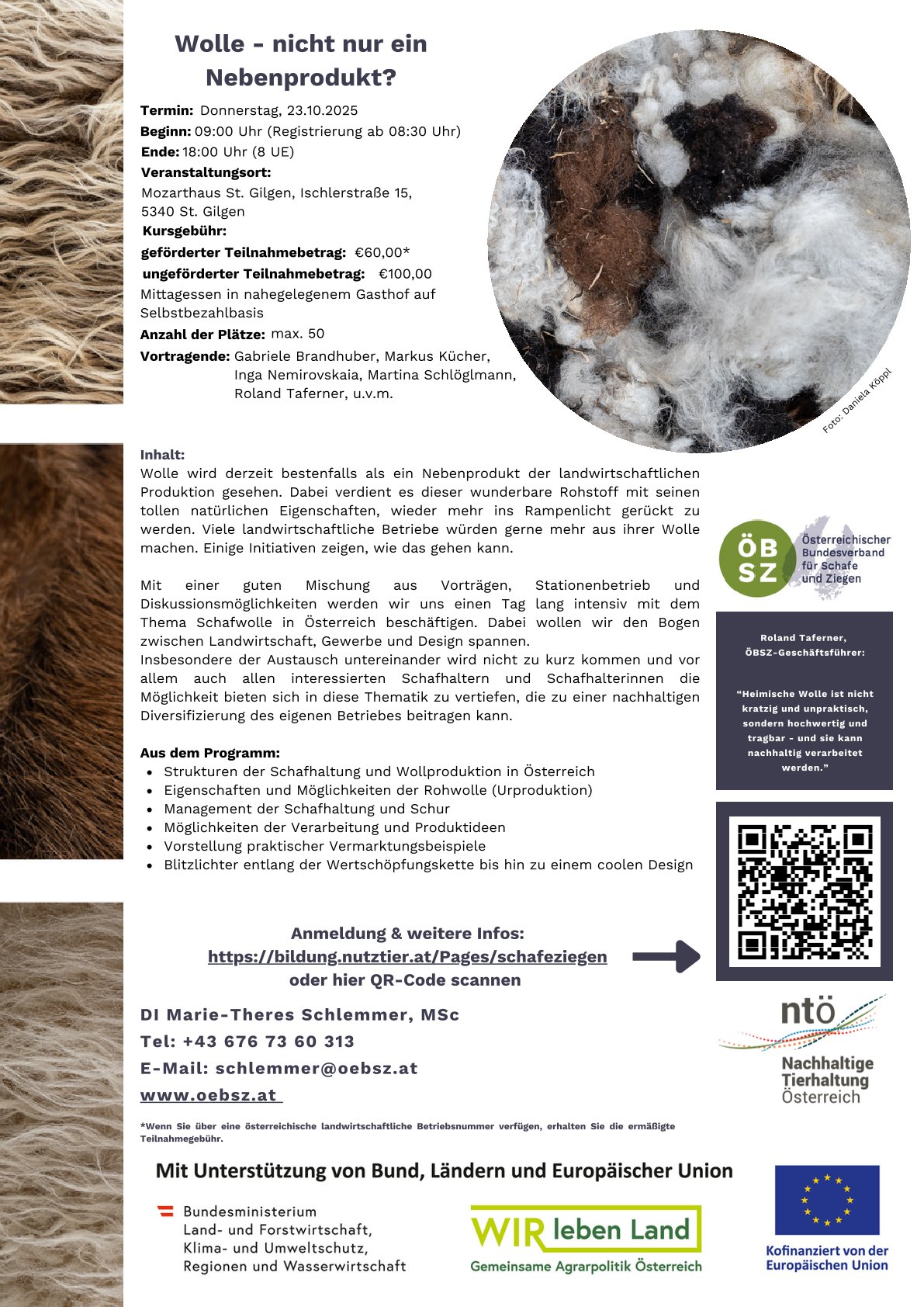 Wolle ist weit mehr als ein Nebenprodukt der Landwirtschaft – sie ist ein wertvoller, natürlicher Rohstoff mit großem Potenzial. Einen ganzen Tag lang widmen wir uns den Chancen der Schafwolle in Österreich: Von den Grundlagen der Schafhaltung über die Eigenschaften der Rohwolle bis hin zu Verarbeitung, Vermarktung und Design. Mit Vorträgen, Praxisstationen und viel Raum für Austausch bietet die Veranstaltung neue Impulse für Schafhalter:innen, Handwerk und Interessierte.